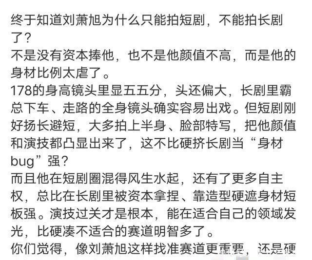 业内分析认为,长剧需全景镜头展现角色气场,如霸总下车、古装仪态,而刘萧旭的H型身材在传统影视镜头中易显腿短,之前曾被长剧剧组因全身镜头效果换角。